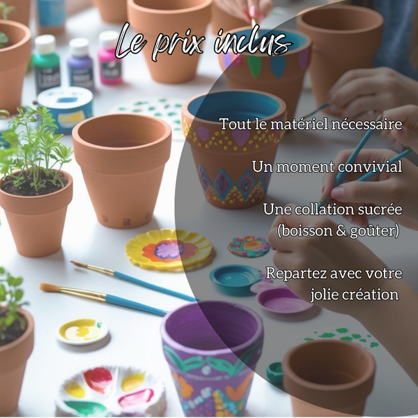 Lors de cet atelier créatif, les enfants commenceront par peindre et décorer un pot en terre cuite selon leur imagination : couleurs, motifs ou petits dessins pour créer un pot unique.
