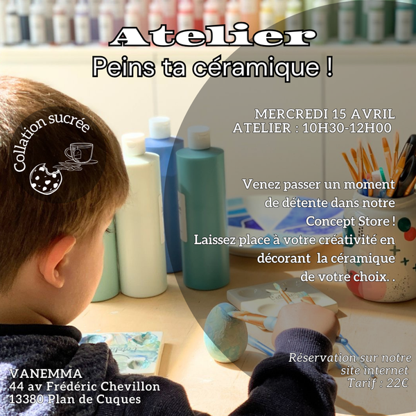 Offrez à votre enfant un moment créatif et ludique lors de cet atelier de peinture sur céramique ! Les enfants pourront choisir une pièce en céramique et la décorer selon leur imagination : couleurs, motifs, personnages… tout est permis pour créer un objet unique.