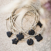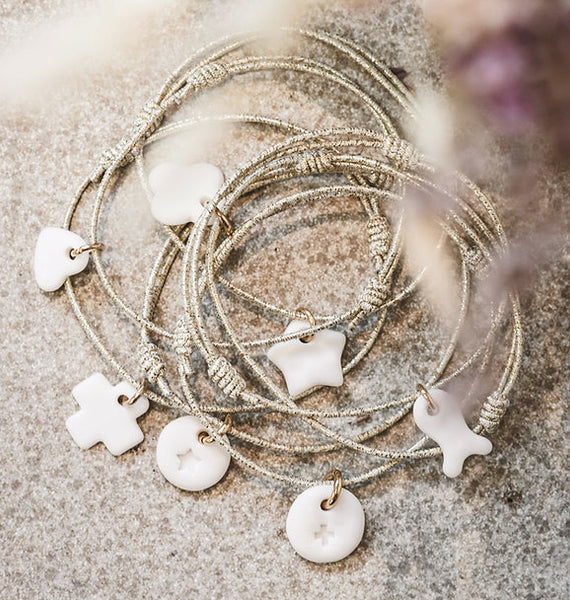 Pendentif en céramique blanche ou noire fabriqué à l'unité dans notre atelier, monté sur lien extensible irisé couleur Or, réglable par noeuds coulissants.