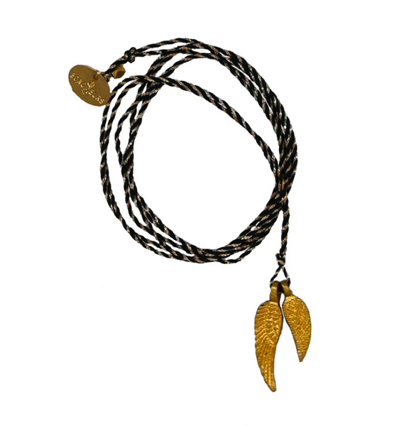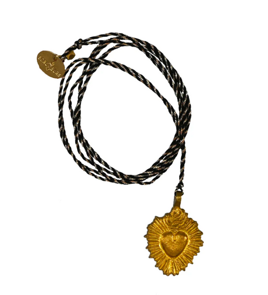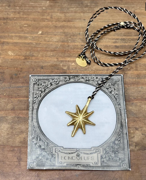 Il est monté sur un fil de coton lurex avec une pampille en laiton. Un nœud coulissant permet de régler sa longueur.