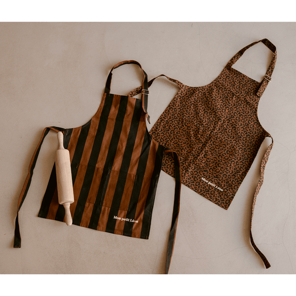 Pour de très beaux moments de cuisine en famille, voici notre tablier en léopard clair, léopard marron foncé ou rayures marrons et noires, à nouer autour de la taille.